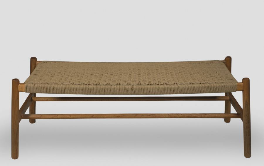 Las icónicas piezas que componen la familia DESIERTO están inspiradas en las formas y sensaciones del vasto paisaje desértico. La colección, diseñada principalmente en madera de tzalam, cuerda de papel color natural y cuerda negra, combina procesos artesanales e industriales. Los materiales utilizados son ideales para climas cálidos. El banco de esta colección está compuesto por cuatro patas cilíndricas en madera sólida ensambladas a una estructura horizontal en forma de H que le da soporte a la base. El asiento está disponible en cuerda color natural o negro.