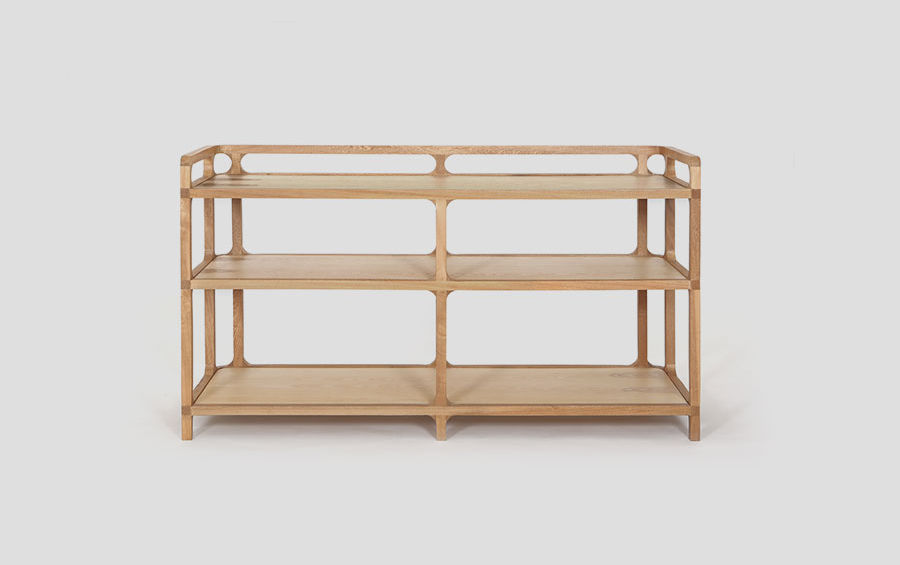 La credenza abierta Jiva combina las líneas rectas con bordes redondeados, característicos de la colección completa diseñada por Andrés Mier y Terán, armonizando a la perfección la solidez de los materiales con su ligereza visual.